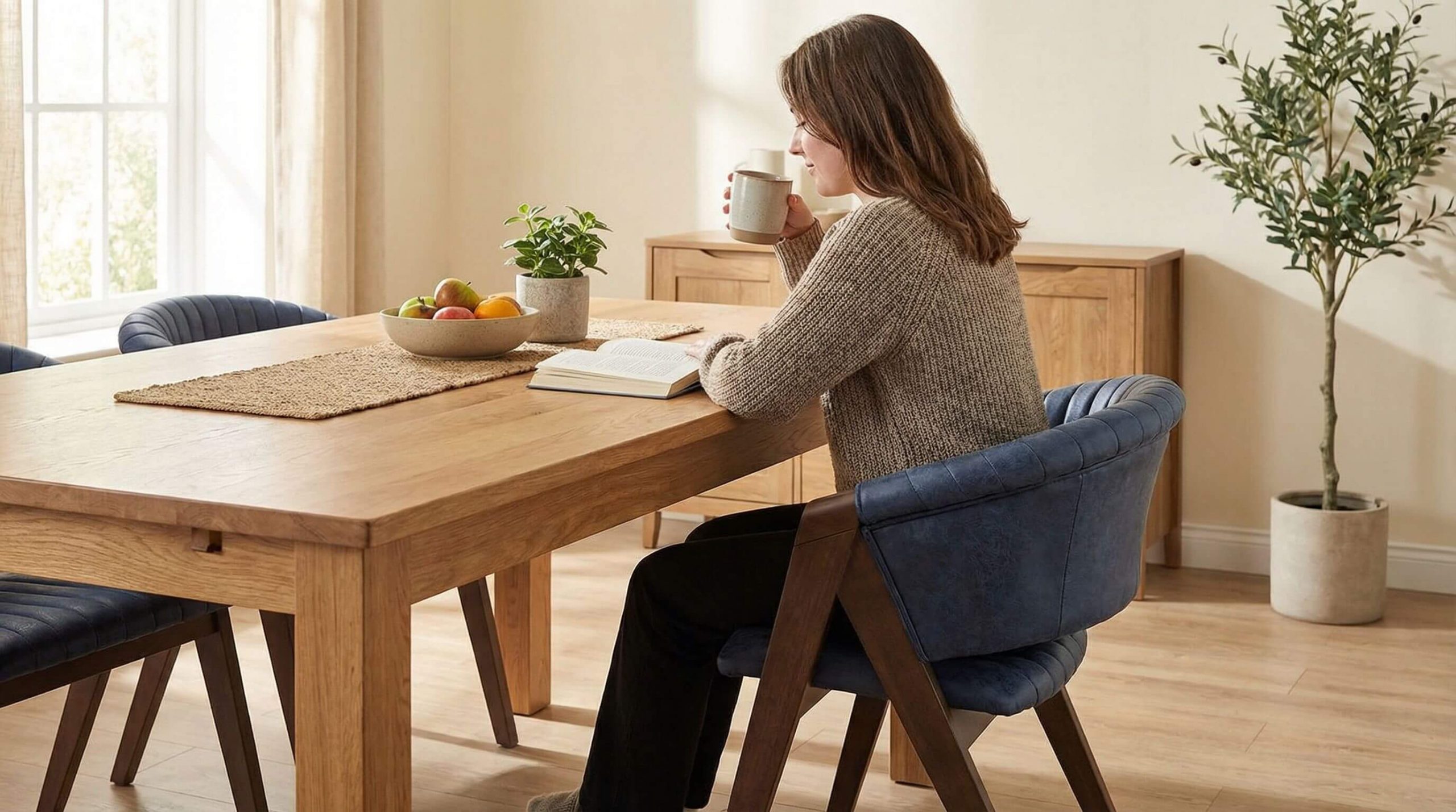 Stilvolles Premium-Interior mit Eichenmöbeln, das dabei unterstützt, eine ergonomische Sitzposition am Esstisch erreichen zu können.